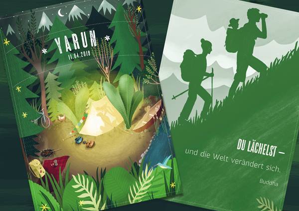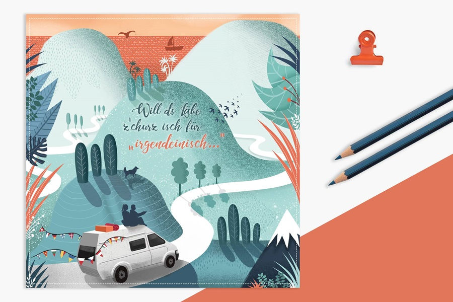 Traveling all around Europe with a dog in a VW Camper open end - what sounds like a dream to most of is, will be the reality for two of our friends from next summer on. To announce their big trip and to invite their friends to come to their farewell party, I illustrated this square card...